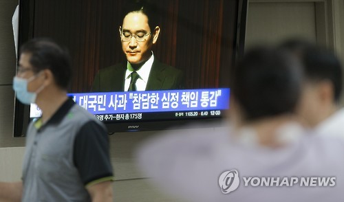 | △ 이재용 부회장, 메르스 진원지 대국민 사과 (서울=연합뉴스) 윤동진 기자 = 23일 오전 서울 한 종합병원에서 내원객이 이재용 삼성전자 부회장의 중동호흡기증후군(메르스) 사태 관련 대국민 사과 방송을 지켜보고 있다. 이 부회장은 이날 서초동 삼성전자 서초사옥에서 중동호흡기증후군(메르스) 사태와 관련해 직접 머리를 숙여 사죄한 뒤 환자 치료는 끝까지 책임지겠다고 밝혔다. |