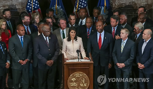 | △ '남부연합기' 내립시다 (컬럼비아<미 사우스캐롤라이나 주> AP/더 스테이트=연합뉴스) 미국내 인종주의의 표상이라는 지적을 받고 있는 남부연합기를 내걸지 말자는 자성의 소리가 높아가고 있다. 사우스캐롤라이나주 흑인교회 총기난사 사건의 범인이 약 150년 전 남북전쟁 때 쓰였던 이 깃발을 웹사이트에 올린 사실이 알려지면서이다. 이번 사건의 발생지를 지역구로 둔 린지 그레이엄(공화) 상원의원은 22일(현지시간) 주 의회 건물에 더는 이 깃발을 걸지 말자고 제의했다. 사진은 백인 이외 인종 출신으로는 처음 이 주 주지사가 된 니키 헤일리(가운데)가 이날 주도 컬럼비아의 주의사당 기자회견을 통해 의사당에서 남부연합기를 내릴 것을 촉구하는 모습. bulls@yna.co.kr |