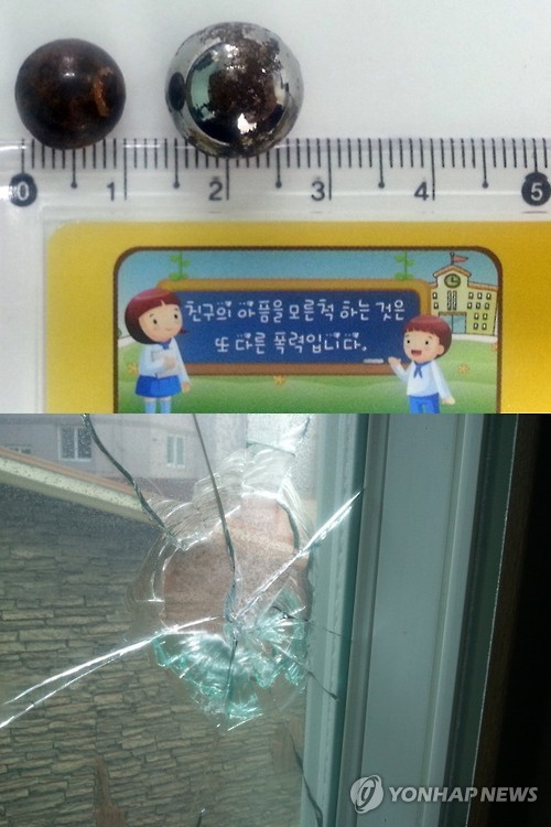 | △ 위험한 쇠구슬 (거제=연합뉴스) 좋아하는 여성이 소유한 승용차나 원룸에 새총으로 쇠구슬을 쏜 혐의(재물손괴)로 경찰이 구속한 김모(58)씨가 사용한 쇠구슬. 아래는 쇠구슬에 맞아 부서진 창문. 2015.6.24 <<거제경찰서>> seaman@yna.co.kr |