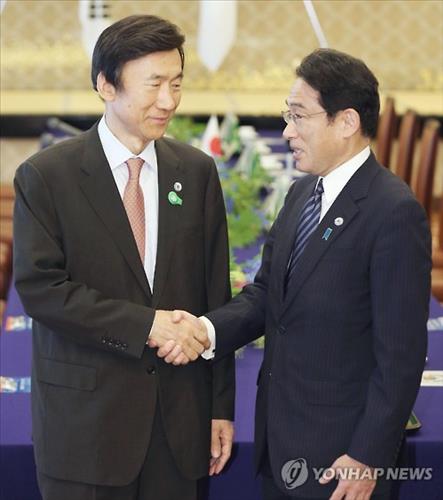 | △ 21일 도쿄에서 열린 한일외교장관회담에 앞서 악수하는 윤병세 외교장관(왼쪽)과 기시다 후미오 일본 외무상.(교도.연합뉴스) |