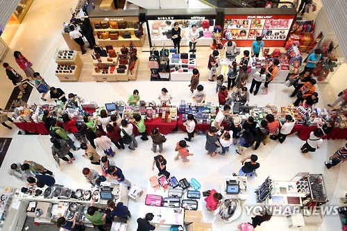 | △ (부산=연합뉴스) 조정호 기자 = 1일 부산시 해운대구 파라다이스호텔에 있는 신세계면세점에서 중국인 단체관광객들이 쇼핑을 하고 있다. 이들은 크루즈선을 타고 부산을 찾았다. 2015.6.1 ccho@yna.co.kr |
