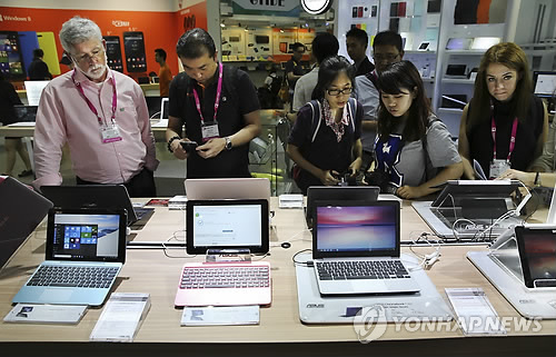 | △ 타이베이 '컴퓨텍스' 2~6일 개최 (타이베이 AP=연합뉴스) 아시아 최대 컴퓨터 등 정보기술(IT) 전시회 '2015 컴퓨텍스'가 2일(현지시간) 대만 타이베이 월드트레이드 센터에서 개막한 가운데 방문객들이 한 컴퓨터 회사의 신 제품들을 살펴보고 있다. 6일까지 계속되며 21개국, 1천7백여 명이 참가해 최신 제품을 선보였다. bulls@yna.co.kr Visitors review new Asus computer products at the Computex trade show in Taipei, Taiwan, Tuesday, June 2, 2015. Computex, one of the world's largest largest IT and computer trade shows, will run from June 2-6. (AP Photo/Wally Santana) |