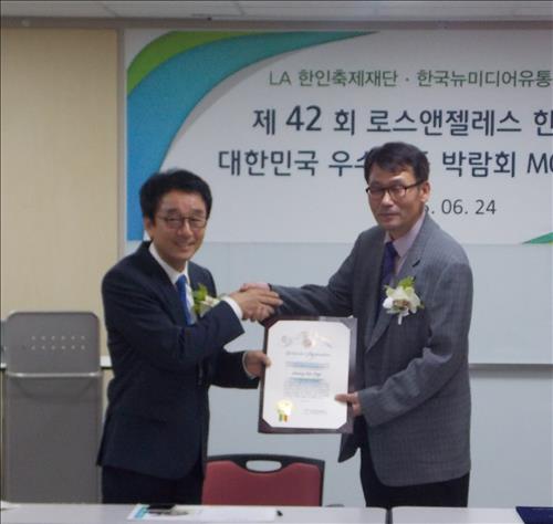 LA한인축제재단(회장 박윤숙)과 한국추진위원회(위원장 정호표 한국뉴미디어유통산업협회 상근부회장)는 24일 오후 서울 중구 바비엥2 호텔에서 '제1회 대한민국 중소기업 우수 제품 엑스포' 개최에 따른 업무협약(MOU)을 체결했다.