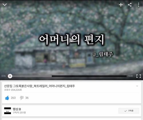 영상은 산문집 중 '어머니의 편지'를 서양화가 백중기 작품을 배경으로 성우 정남이 낭독하는 형태다.