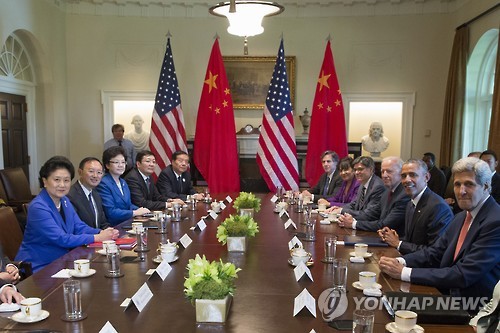 | △ 버락 오바마 미국 대통령은 24일(현지시간) 제7차 미·중 전략경제대화 참석차 방미한 류옌둥 부총리를 비롯한 중국 대표단을 접견하고 "북한에 핵과 경제를 동시에 개발하려는 노력이 성공할 수 없음을 보여주는 것의 근본적인 중요성을 논의했다"고 백악관이 이날 성명에서 밝혔다. (AP=연합뉴스) |