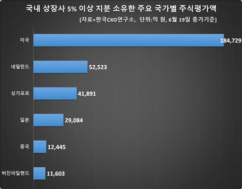 조사는 금융감독원 보고서를 토대로 했다. 5% 이상 지분을 보유한 외국인 및 외국 투자법인이 소재한 국적(國籍)을 기준으로 분석한 것이다.
