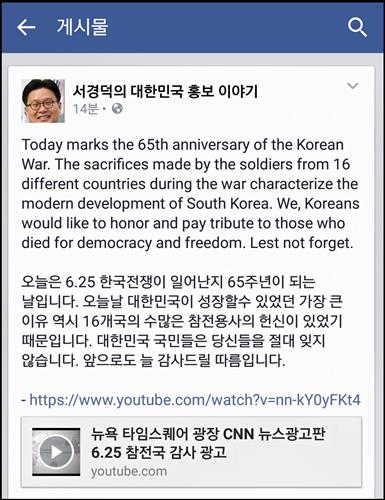(서울=연합뉴스) 왕길환 기자 = 한국 홍보 전문가인 서경덕 성신여대 교수가 6·25 한국전쟁 65주년을 맞아 참전국에 감사의 뜻을 밝히는 영상 광고를 16개국 페이스북 계정에 올렸다.
