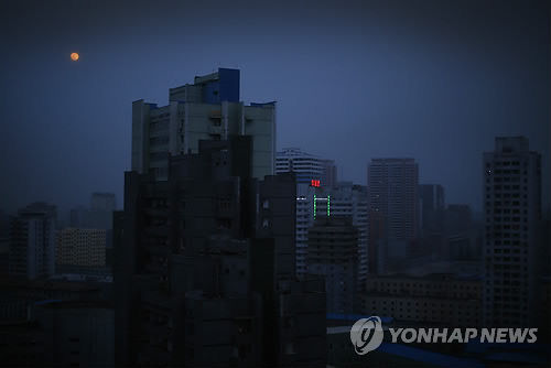| △ 5월 3일 평양의 밤 (평양 AP=연합뉴스) 어둠에 잠긴 평양에 달이 떠 있다. 북한은 노동당 창건 기념일 등 올해 하반기 주요 기념일을 앞두고 20~50%씩 전력생산을 늘리도록 독려하고 있다. 이와 함께 만성적인 에너지난을 완화하기 위해 태양광 등 대체자원 개발을 추진하고 있다. 북한 농촌 많은 지역에서 태양전지를 이용해 전력 생산을 하고 있다. ciy@yna.co.kr In this May 3, 2015, photo, the moon hangs over Pyongyang city which is mostly in darkness, in North Korea. North Korea is racing to boost its electricity supply by 20 to 50 percent ahead of a major anniversary later this year and is pushing alternative resources like solar, which is already used extensively in the countryside, to ease its chronic shortages of energy. (AP Photo/Wong Maye-E) |