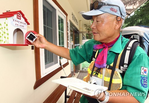 | △ 도보여행가 남상범 씨 (부산=연합뉴스) 김재홍 기자 = 전국 111곳 천주교 성지순례에 나선 도보여행가 남상범(83) 씨. 2005년부터 전국을 돌며 도보여행을 하고 있는 남씨가 10년간 걸은 거리는 대략 3만㎞가 넘는다. 남씨가 부산시 금정구 오륜대 한국순교자 박물관 앞에서 천주교 성지순례 인증 도장을 찍고 있다. 2015.6.25 pitbull@yna.co.kr |