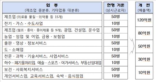 예를 들면 광업과 제조업, 건설업 등 8개 업종은 상시근로자가 50명, 금융·보험업, 도·소매업 등 10개 업종은 상시근로자가 10명 미만이면 무조건 소기업이었다.