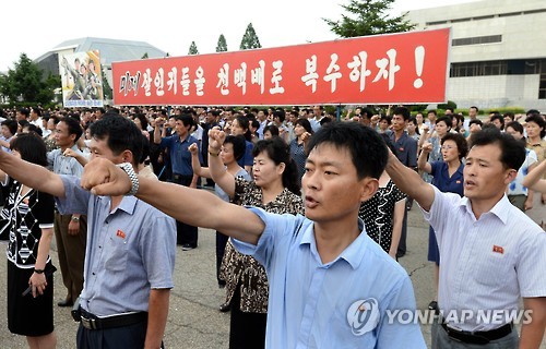 | △ 북, 6·25 앞두고 성토대회 (평양 조선중앙통신=연합뉴스) 6·25 미제반대투쟁의 날을 즈음해 노동계급과 직맹원들의 성토대회가 24일 평양시 중앙계급교양관 앞마당에서 진행됐다고 조선중앙통신이 24일 촬영보도했다. 2015.6.24 zjin@yna.co.kr |