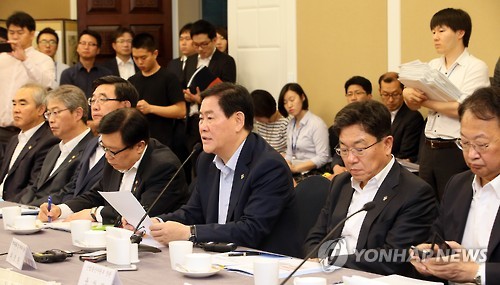 | △ 최경환, 하반기 경제정책방향 설명 (서울=연합뉴스) 진성철 기자 = 최경환 경제부총리가 25일 국회 귀빈식당에서 열린 하반기 경제정책방향 당정협의에서 인사말하고 있다. 오른쪽 부터 유일호 국토교통부 장관, 윤상직 산업통상자원부 장관, 최 부총리, 이동필 농림축산식품부 장관, 이기권 고용노동부 장관, 임종룡 금융위원장, 이성호 국민안전처 차관. |