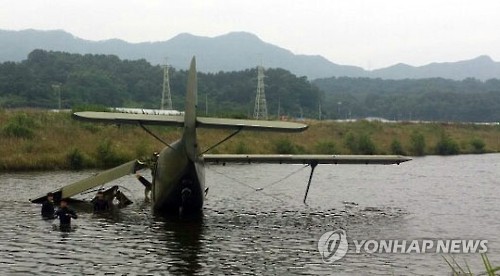 | △ 하천에 추락한 공군 소속 훈련기 (옥천=연합뉴스) 박병기 기자 = 25일 오후 1시 7분께 충북 옥천군 군서면 상중리 하천에 공군 소속 T-11 훈련기가 추락했다. 이 사고로 1명이 다쳐 군용 헬기로 통해 이송 중이다. 2015.6.25 vodcast@yna.co.kr |