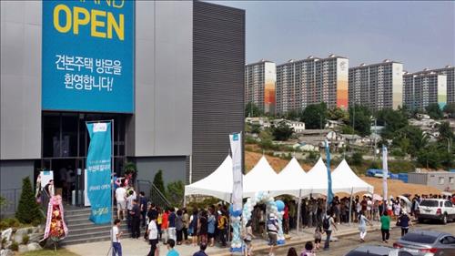 | △ 지난 20일 GS건설 옥길자이 견본주택에 몰린 내방객들이 줄을 지어 입장하고 있다. GS건설 제공. |