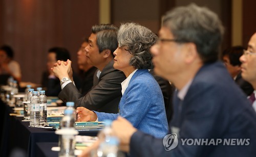 | △ '진지하게' (경주=연합뉴스) 김준범 기자 = 25일 오후 경북 경주시 신평동 현대호텔에서 열린 '2015 하계 대학총장세미나'에 참석한 전국 대학 총장들이 대학 발전 비전과 전략에 대한 내용의 발표를 듣고 있다. 2015.6.25 psykims@yna.co.kr |