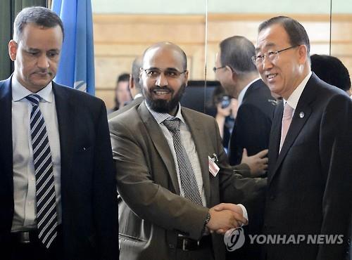반 총장은 15일(현지시간) 스위스 제네바에서 열린 예멘 평화협상에 참석, 취재진의 카메라 앞에서 압드 알와하브 알후마이카니와 함께 악수하면서 포즈를 취했다.