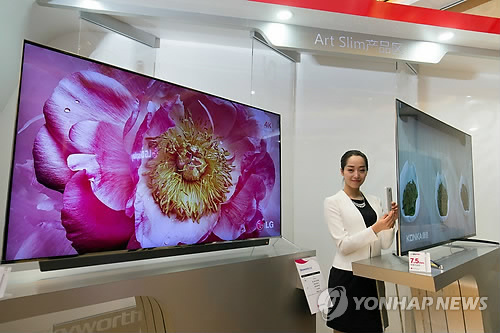 | △ LG디스플레이, 베이징서 '아트슬림 프로모션' 행사 개최 (서울=연합뉴스) LG디스플레이는 지난 15일 중국 베이징에서 고객사, 유통업체, 주요 기관·협회 인사 130여명을 초청해 '아트슬림 프로모션' 행사를 열었다고 16일 밝혔다. 아트슬림은 UHD 해상도의 55인치와 65인치 제품의 두께를 스마트폰에 버금가는 7.5㎜와 8.2㎜로 구현했다. 아트슬림 프로모션 행사에서 도우미가 전시된 아트슬림 TV와 스마트폰 두께를 비교하고 있다. 2015.4.16 << LG디스플레이 제공 >> photo@yna.co.kr |