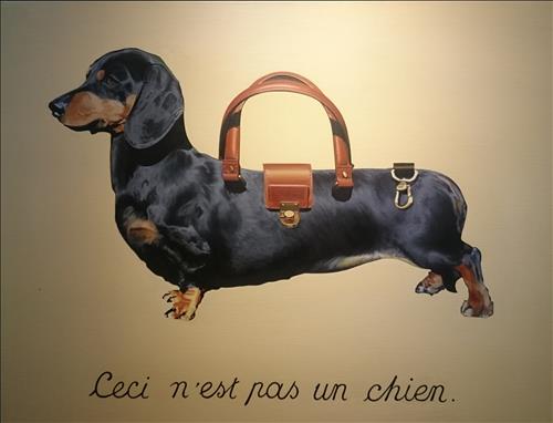 (서울=연합뉴스) 고유선 기자 = 작가가 키우는 닥스훈트 강아지 그림 밑에는 어디선가 본 듯한 낯익은 글귀가 써 있다. 'Ceci n'est pas un chien'(이것은 개가 아니다)