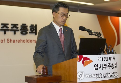 | △ SK 주총서 SK C&C와 합병안 원안대로 통과 (서울=연합뉴스) 윤동진 기자 = 26일 오전 서울 서린동 SK 본사빌딩에서 열린 임시 주주총회에서 SK 조대식 사장이 의사봉을 두드리고 있다. 이날 주총에서 SK는 SK C&C와의 합병계약 건을 통과시켰다. |