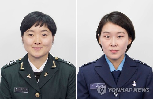| △ 최초의 여군 군종목사 (서울=연합뉴스) 26일 학생군사학교와 종합행정학교에서 거행된 학사, 단기 간부사관, 기술행정 준사관, 군종사관 등에 대한 통합임관식에서 최초의 여군 군종목사가 된 정은해 대위(왼쪽)와 남소연 중위. (육군 제공) |