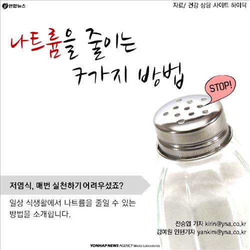 (서울=연합뉴스) 전승엽 기자·이은희 인턴기자 = 밥그릇에 국을 담고 건더기 위주로 먹는 습관을 들이면 소금 섭취를 줄일 수 있다고 합니다. 나트륨을 줄이는 다른 방법도 알아보시죠.
