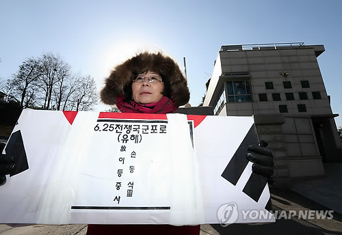 | △ 유해로 송환된 국군포로 손동식씨의 딸 손명화씨가 서울 용산구 국방부 앞에서 아버지의 유해가 담긴 관을 들고 1인시위를 하고 있다. (연합뉴스 자료사진) |