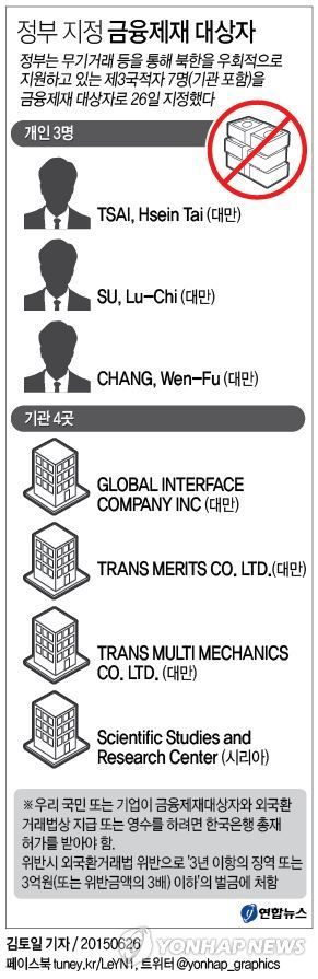 정부가 26일 지정한 금융제재 대상은 대만 국적의 개인 3명과 기관 3곳, 시리아 국적의 기관 1곳 등이다.