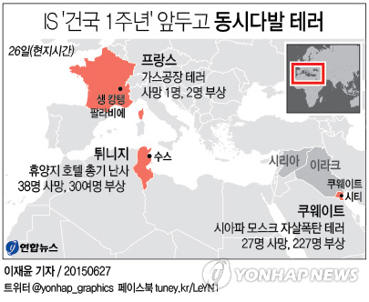 튀니지의 휴양지 수스의 한 호텔에서는 무장괴한이 소총을 난사해 최소 37명이 사망했고, 쿠웨이트 수도 쿠웨이트 도심의 시아파 모스크에서도 IS가 자행했다고 주장한 폭탄테러가 발생해 25명이 숨지고 202명이 부상했다.