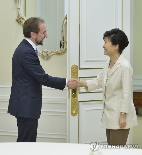 | △ 박근혜 대통령이 지난 25일 청와대에서 유엔 북한인권사무소 개소식에 참석하기 위해 방한한 자이드 알 후세인 최고대표와 인사하고 있다. 2015.6.27<<연합뉴스DB>> |