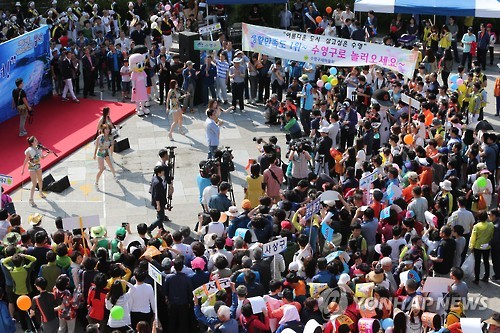 | △ '메르스 극복' 부산 경제살리기 인파 (부산=연합뉴스) 조정호 기자 = 28일 오후 부산 사직야구장에서 열린 '메르스 위기 극복 범시민 경제살리기 대회'에 많은 시민이 몰렸다. 서병수 시장은 "올 여름 부산으로 와달라'고 호소했다. 2015.6.28 ccho@yna.co.kr |