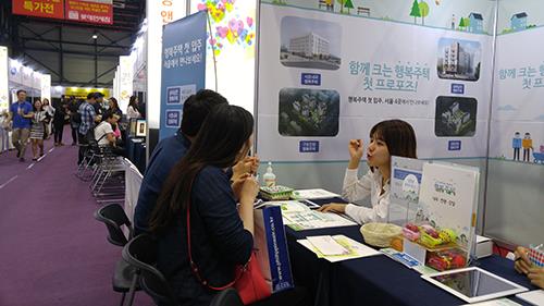 | △ 지난 27∼28일 서울 강남구 무역전시장(SETEC)에서 열린 결혼박람회의 행복주택 홍보부스에 관람객이 찾아와 설명을 듣고 있다. 2015.6.29. <<국토교통부>> |