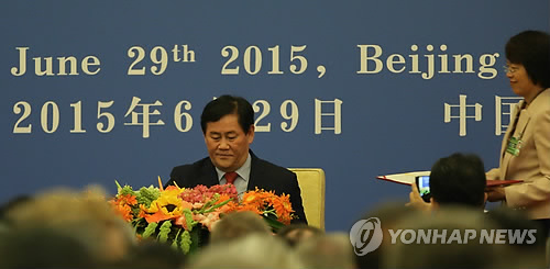 | △ AIIB 협정문 서명식에 참석한 최경환 부총리 (베이징=연합뉴스) 이준삼 특파원 = 최경환 경제부총리 겸 기획재정부 장관이 29일 오전 9시(현지시간) 중국 베이징(北京) 인민대회당에서 열린 아시아인프라투자은행(AIIB) 협정문 서명식에 한국 정부를 대표해 참석, 협정문에 서명하고 있다. |