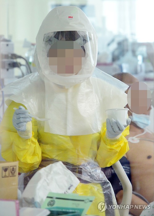 | △ '메르스 환자, 꼭 치료하겠습니다' (서울=연합뉴스) 윤동진 기자 = 19일 오전 메르스 환자가 격리 치료 중인 서울 중구 국립중앙의료원에서 방호복을 입은 한 간호사가 업무를 보고 있다. 2015.6.19 mon@yna.co.kr |