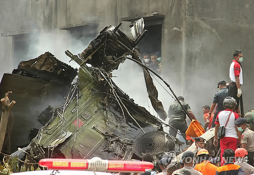 | △ 인도네시아 군용기 추락 현장 (북수마트라 AP=연합뉴스) 30일 인도네시아 북(北)수마트라 메단 시 군 수송기 추락사고 현장에서 시신 수색 작업을 벌이고 있다. ciy@yna.co.kr |