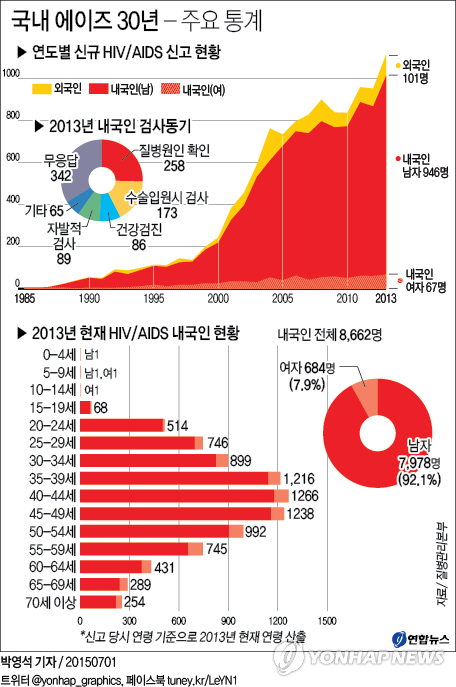 보건복지부와 질병관리본부가 지난해말 기준으로 집계한 '에이즈 현황자료'를 보면 국내에서 에이즈의 원인 바이러스인 'HIV'에 감염된 사람은 지금까지 8천600여명에 이른다. 이 가운데 대다수(92.1%)는 남성이다.