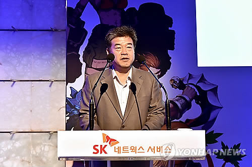 | △ 모바일 게임 신작 발표를 하는 서보국 SK네트웍스서비스 대표이사(SK네트웍스서비스 제공) 인물 |