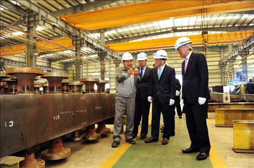 | △ SK건설은 매년 CEO가 비즈파트너사를 직접 방문해 동반성장 간담회를 갖고 경영현황과 애로사항을 청취하고 있다. 사진은 올해 5월 조기행(왼쪽 세번째) SK건설 사장이 전북 군산에 소재한 협력업체 ㈜KHE를 방문해 공장을 둘러보며 KHE社 관계자의 설명을 듣고 있는 모습. SK건설 제공. |