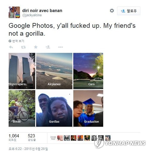 미국 뉴욕에서 일하는 흑인 프로그래머 재키 앨신은 지난달 28일 트위터에 자신의 '구글 사진' 캡처 화면과 함께 "구글 사진, 당신들 모두 ×됐어. 내 친구는 고릴라가 아니란 말야"라는 글을 올렸다.