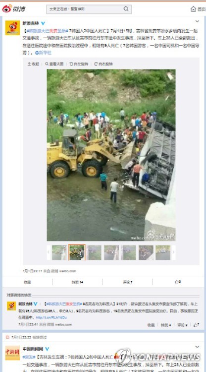 (서울=연합뉴스) 윤고은 기자 = 중국 지린(吉林)성 지안(集安)에서 1일 저녁 한국 공무원들을 태운 버스가 다리에서 추락, 최소한 10명이 숨지고 16명이 다친 소식이 전해지자 사회관계망서비스(SNS)에서는 안타까움과 답답함을 표하는 목소리가 교차했다.