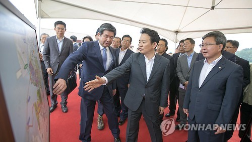 | △ 화성국제테마파크 사업 성공 유치 협약 (화성=연합뉴스) 남경필 경기도지사와 채인석 화성시장, 최계운 한국수자원공사(K- water) 사장이 2일 오전 화성 송산그린시티 내에 있는 송산건설단에서 '국제테마파크의 성공적 유치를 위한 공공기관 간 상호협력 협약(MOU)'을 체결하고 사업부지를 둘러보고 있다. 2015.7.2 <<경기도 제공>> hedgehog@yna.co.kr |
