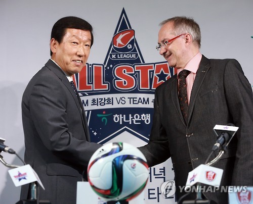 (서울=연합뉴스) 안홍석 기자 = 최강희 전북 현대 감독과 울리 슈틸리케 한국 축구 대표팀 감독이 2015 하나은행 K리그 올스타전 선수 선발을 놓고 웃음 섞인 자존심 대결을 펼쳤다.