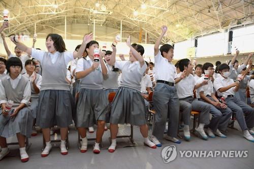| △ 일본 축구대표팀이 2일(일본 현지시간) 치러진 난적 잉글랜드와의 캐나다 월드컵 준결승에서 선제골을 넣은 순간 일본 도치기현 우쓰노미야(宇都宮)의 한 중학교에서 단체 응원중이던 학생들이 환호하고 있다. |