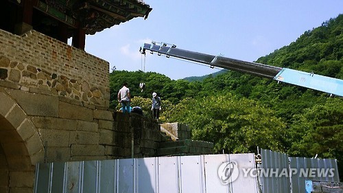 | △ 문경새재는 보수 중 (문경=연합뉴스) 손대성 기자 = 경북 문경새재 1관문 누문(樓門)으로 오르는 계단이 이탈돼 공사업체가 보수공사를 벌이고 있다. 2015.7.2 sds123@yna.co.kr |