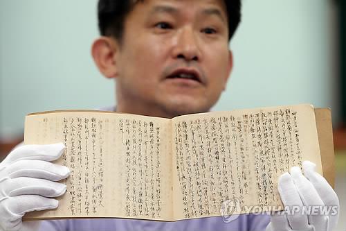 | △ 2013년 8월 8일 박한용 민족문제연구소 교육홍보실장이 서울 성북구 안암동 고려대학교에서 공개된 일본군위안소 조선인 관리자의 일기를 들어보이고 있다. 이 일기는 지난 1942년부터 1944년 말까지 버마(현 미얀마)와 싱가포르의 일본군 위안소에서 일하던 한 조선인이 작성한 것으로, 일본군위안소의 경영 실태와 일본군위안부의 생활상 등이 담겨 있다. 또 일본군이 일본군위안부를 여러 차례 조직적으로 동원한 사실 등도 남겨져 있다. (연합뉴스 자료사진) |