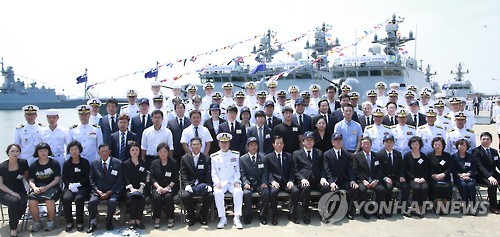 | △ 제2연평해전 13주년 기념식 (평택=연합뉴스) 이상학 기자 = 제2연평해전 13주년인 29일 오전 유가족과 국회의원, 장병 등이 경기도 평택 해군 제2함대 사령부에서 기념식을 마친 뒤 여섯 용사들 이름으로 명명된 유도탄고속함(PKG) 앞에서 기념촬영을 하고 있다. 2015.6.29 leesh@yna.co.kr |