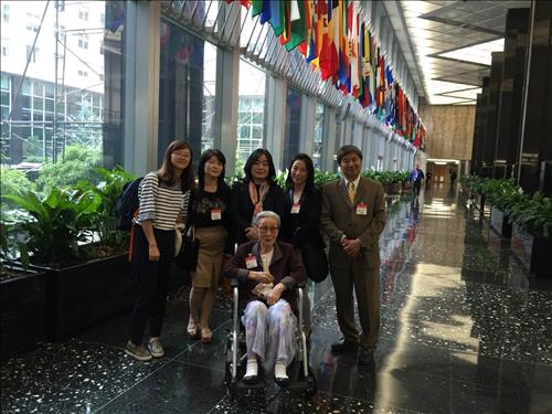 | △ 미국 워싱턴D.C.를 방문 중인 일본군 위안부 피해자 김복동(89·가운데 휠체어에 앉은 분)할머니가 2일(현지시간) 오후 미 국무부를 찾아 관리들에게 위안부 문제 해결을 촉구한 뒤 청사 내에서 기념촬영을 했다. 김 할머니 바로 뒷편은 윤미향 한국정신대문제대책협의회 상임대표. 2015.7.3 |