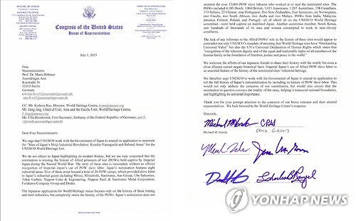 하원의원 6명 '전쟁포로 반영 안된 日세계유산 등재 반대' 연명서한