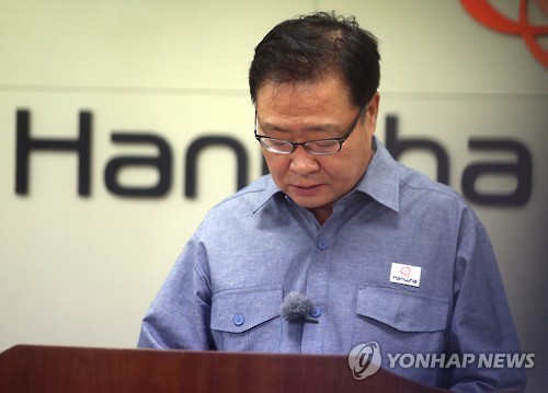 | △ 침통한 표정의 김창범 대표이사 (울산=연합뉴스) 김용태 기자 = 3일 울산시 남구 한화케미칼 2공장 폐수처리장 저장조에서 발생한 폭발사고에 대해 한화케미칼 김창범 대표이사가 사과하고 있다. |