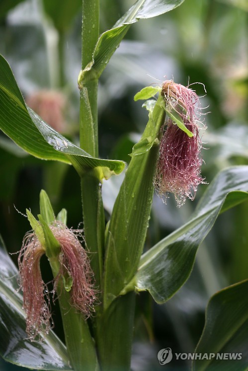 | △ 빗물 머금은 옥수수 (강릉=연합뉴스) 유형재 기자 = 극심한 가뭄이 계속되던 강릉을 비롯한 강원 동해안 지역에 26일 장맛비가 내려 밭작물 해갈에 어느 정도 도움이 된 가운데 옥수수가 빗물을 머금고 있다. 2015.6.26.DB. yoo21@yna.co.kr |