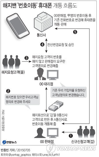 다른 매장의 판매업자는 이 정보를 산 뒤 B통신사로 가입하고 싶은 신규 고객이 오면 해지신청된 A통신사의 휴대전화 번호를 신규 고객의 명의로 변경한다.